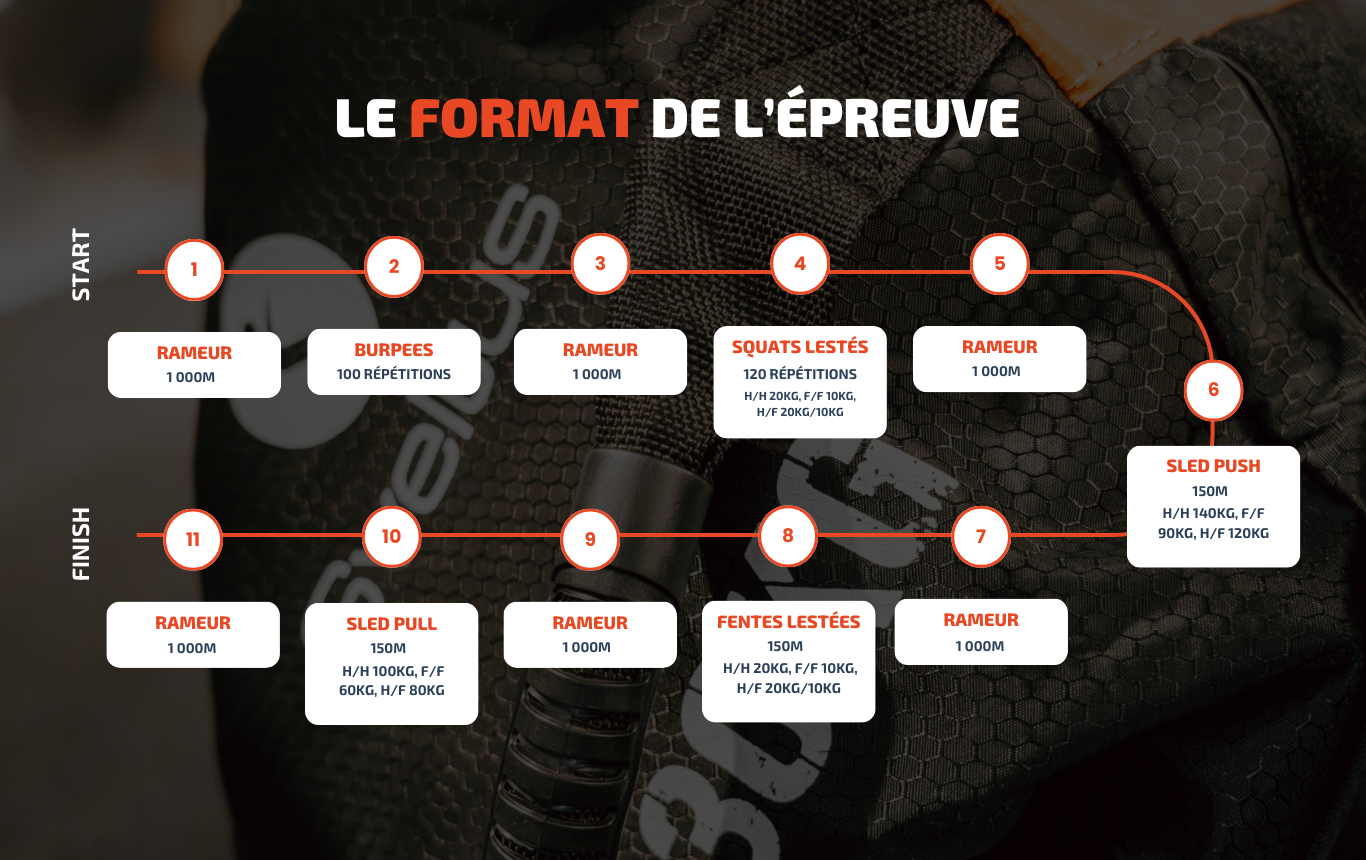 Au programme : burpees, squats lestés, sled push, fentes lestées, sled pull, avec plusieurs passages sur rameur entre chaque épreuve. Ce format exigeant sollicite à la fois le cardio, la puissance musculaire et la stratégie d’équipe.